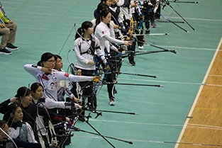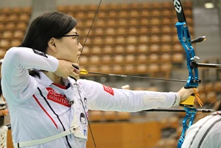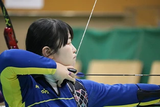 室内大会は18メートル先の小さな的に矢を放つ方式で、屋外の70メートル先の的を狙う五輪競技と異なります。