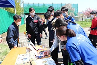 経験者には専門的指導を、未経験者・初心者には体験コーナーを設け、両選手らが熱心に指導。