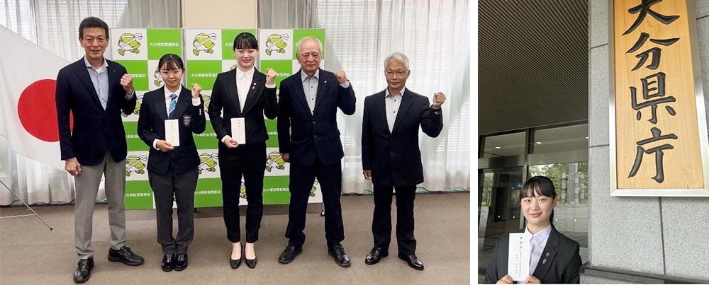 世界ユース選手権に出場する末松愛梨選手(近畿大学2年)とともに、県関係者やメディアを前に大分県から日本代表として出場する国際大会での健闘を誓いました。