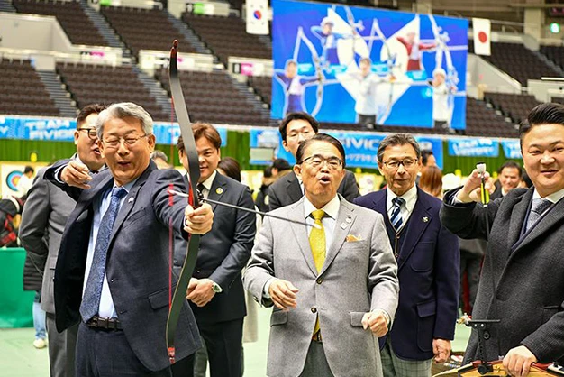 大村愛知県知事や韓国総領事も来場し開会挨拶後、体験コーナーでアーチェリー体験。