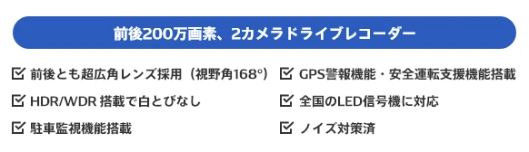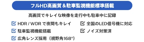 | 緊急録画 停止機能 | 事故などの大きな衝撃を受けた際に上書きしないように自動で録画を停止します。 ON/OFF調整可 | ||