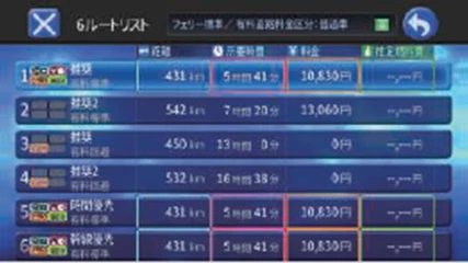 有料優先/有料回避(一般優先)/時間優先/幹線優先(高速道路や国道など走行しやすい道)などを考慮した6ルートから、好みに合わせてルートを選択できます。