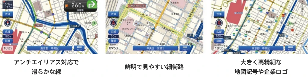 さらに地図記号や企業ロゴなども、大きく高精細なマークで表示することで、地図の視認性を向上しています。