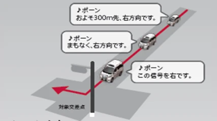 案内交差点の直前になると音声とコーション音で対象交差点をお知らせします。信号機がある交差点の場合、信号機を目安に案内するのでさらにわかりやすくなっています。