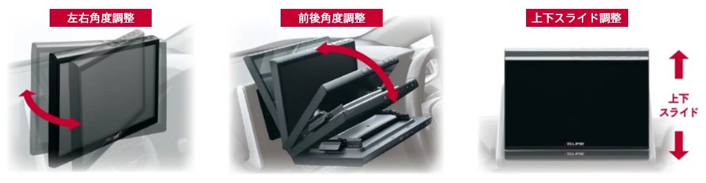 また、取り付け後も左右-15°~15°の首振りや-20°~60°の前後角度、上下スライドの位置調整ができます。ドライバーの操作しやすい角度はもちろんのこと、日差しが反射して画面が見えにくい場合も、見やすい角度に手動で調整することが可能です。