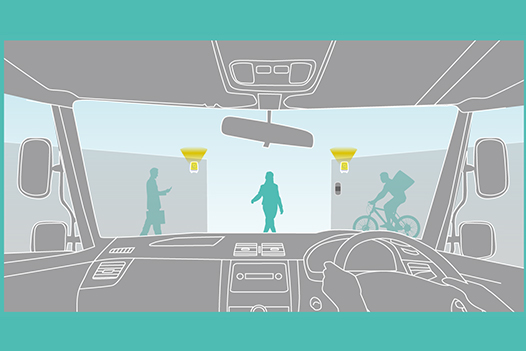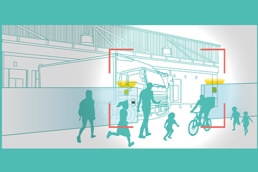 従来システム(敷地外の歩行者や自転車に注意喚起)とは異なり、敷地内のドライバーに注意喚起することで事故の危険回避を支援。より安全な社会の実現を目指します。