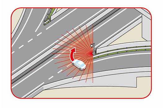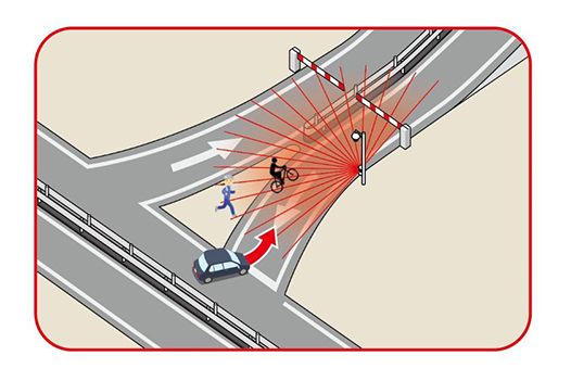 高速道路出口部に設置したレーザーセンサーで、侵入する人や自転車、逆走車両を検知し、自動的に音声で警告。同時に、高速道路管制室に通知します。管制室では、立入、逆走発生場所の映像を確認し、スピーカーを通じ係官が遠隔で警告することが可能です。