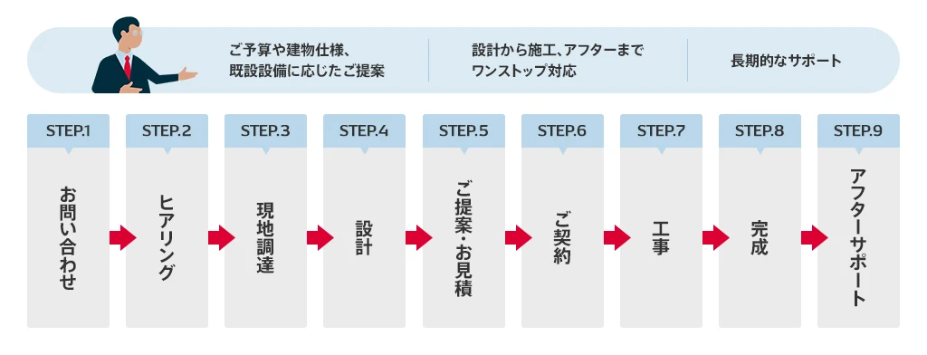 導入後の長期延長保証(オプション)や法令定期点検(有償)など、導入後も長期にわたり点検・修理対応などをお任せいただけます。