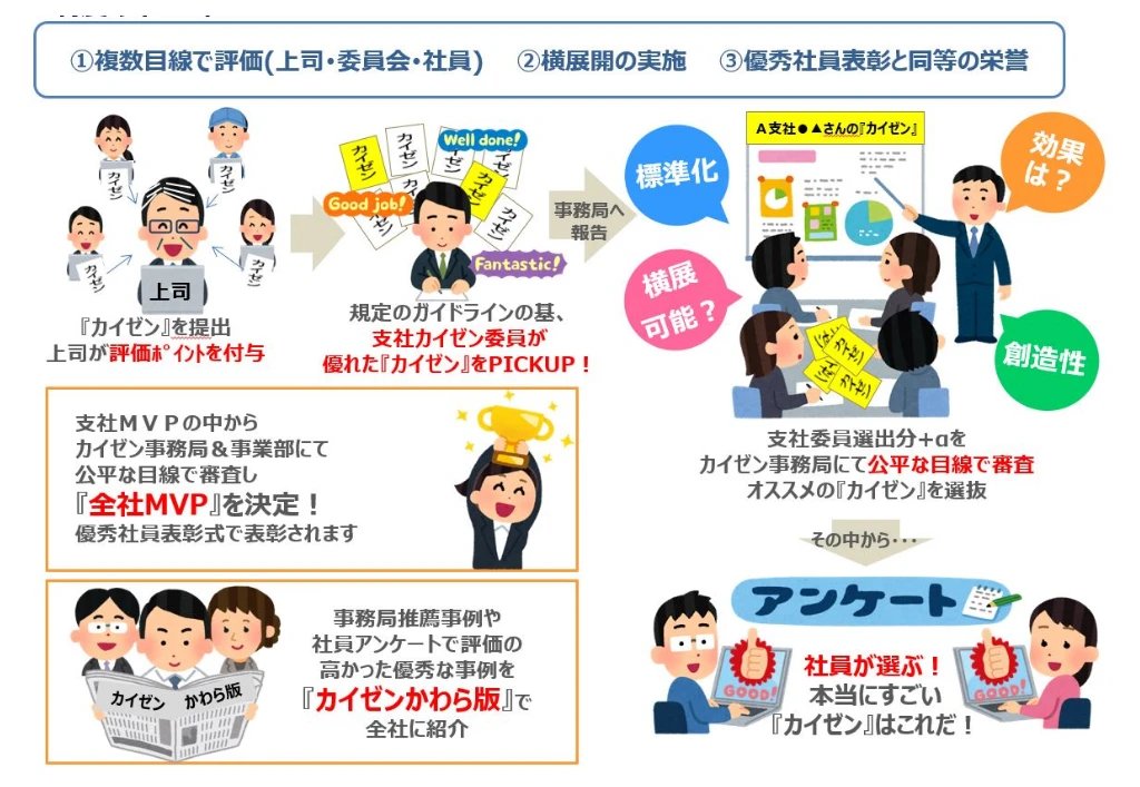 テーマは売上向上から経費削減など様々。その全ては社員一人ひとりの気づきから。