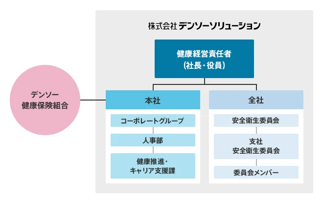デンソーソリューションは、社員の健康保持と増進を目的とした健康づくりを経営施策の重点項目として位置づけています。 2018年10月に、「健康宣言」を発表し、社内外に健康づくりの考え方を発信するとともに、健康推進体制の整備、施策の計画と実行を進めてきました。社員とともに、目指すべき健康づくりの具現化に向けて、今後も健康施策の取り組みの充実を図っています。