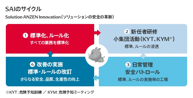 各部署で抱える安全含めたガバナンス問題の解決を目的としたSolustion ANZEN Inovetionプロジェクト、略してSAIプロ活動をしています。SDCAの考え(SAIのサイクル)に基づき、問題の解決から標準化、浸透・定着までを目指しています。